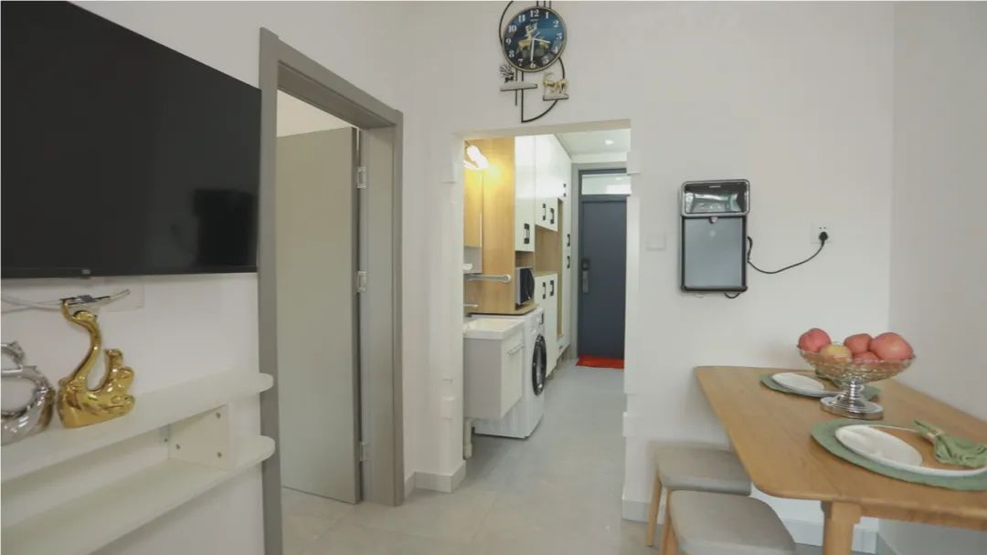 客餐廳——移動(dòng)墻體,借用臥室空間規(guī)劃了5.7平米的客餐廳,雖然面積有限,但功能完善好用。