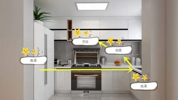 廚房最重要的是動線設(shè)計,如果整體動線設(shè)計不合理,不但讓使用者操作不方便,而且還會讓原本狹小的空間更加局促。所以,動線設(shè)計要根據(jù)業(yè)主的烹飪習(xí)慣和生活習(xí)慣,結(jié)合廚房的格局,合理進(jìn)行功能區(qū)的劃分,決定冰箱、水池、備餐臺、燃?xì)庠?、裝盤臺等位置,減少不必要的走動。