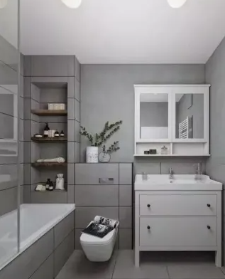解決衛(wèi)生間儲物問題可以,量身定制浴室柜,或利用壁龕,增加儲物。