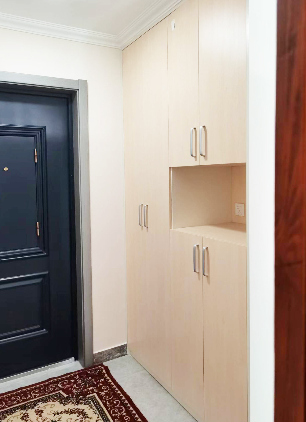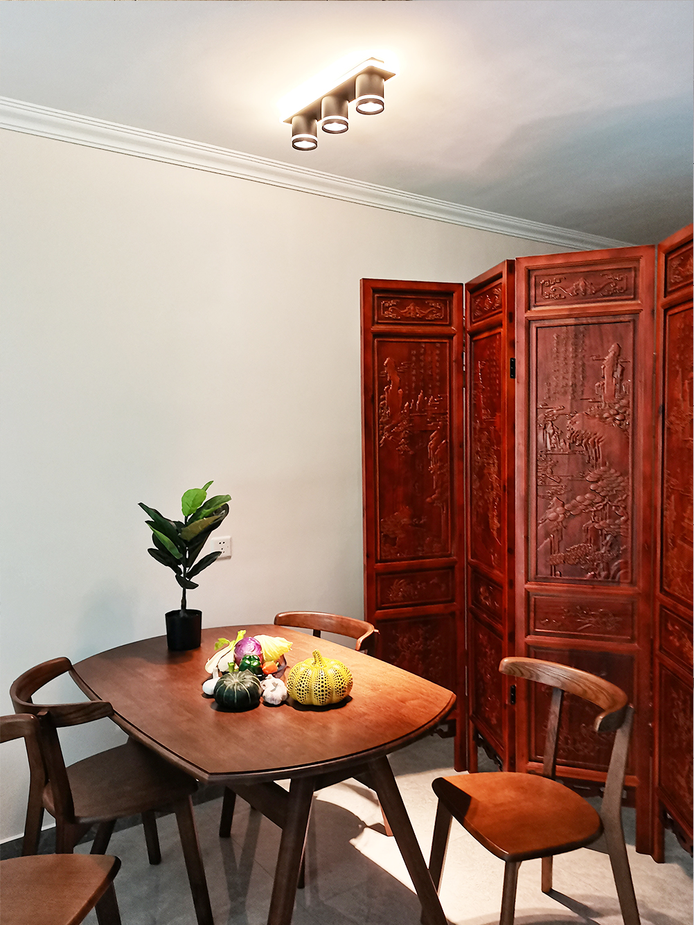 在進(jìn)門的左手邊,設(shè)計(jì)師利用定制家具打造了一組通頂鞋帽柜,滿足一家人的儲(chǔ)物需求。另外,利用中式屏風(fēng)進(jìn)行遮擋,增加了客餐廳隱私性。