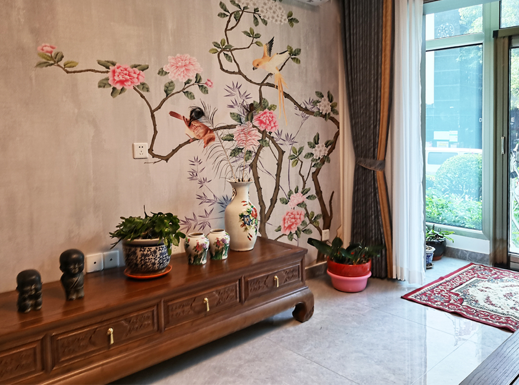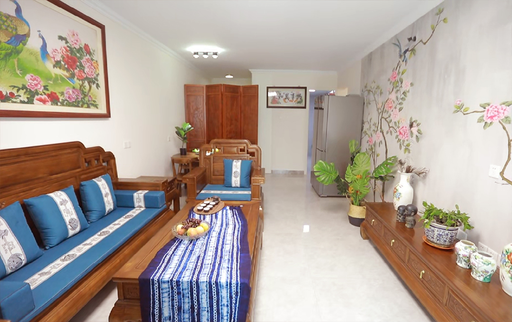 客廳利用壁布來增加中式元素的氛圍,擺放下中式家具的同時(shí),最大化留白,便于行走。