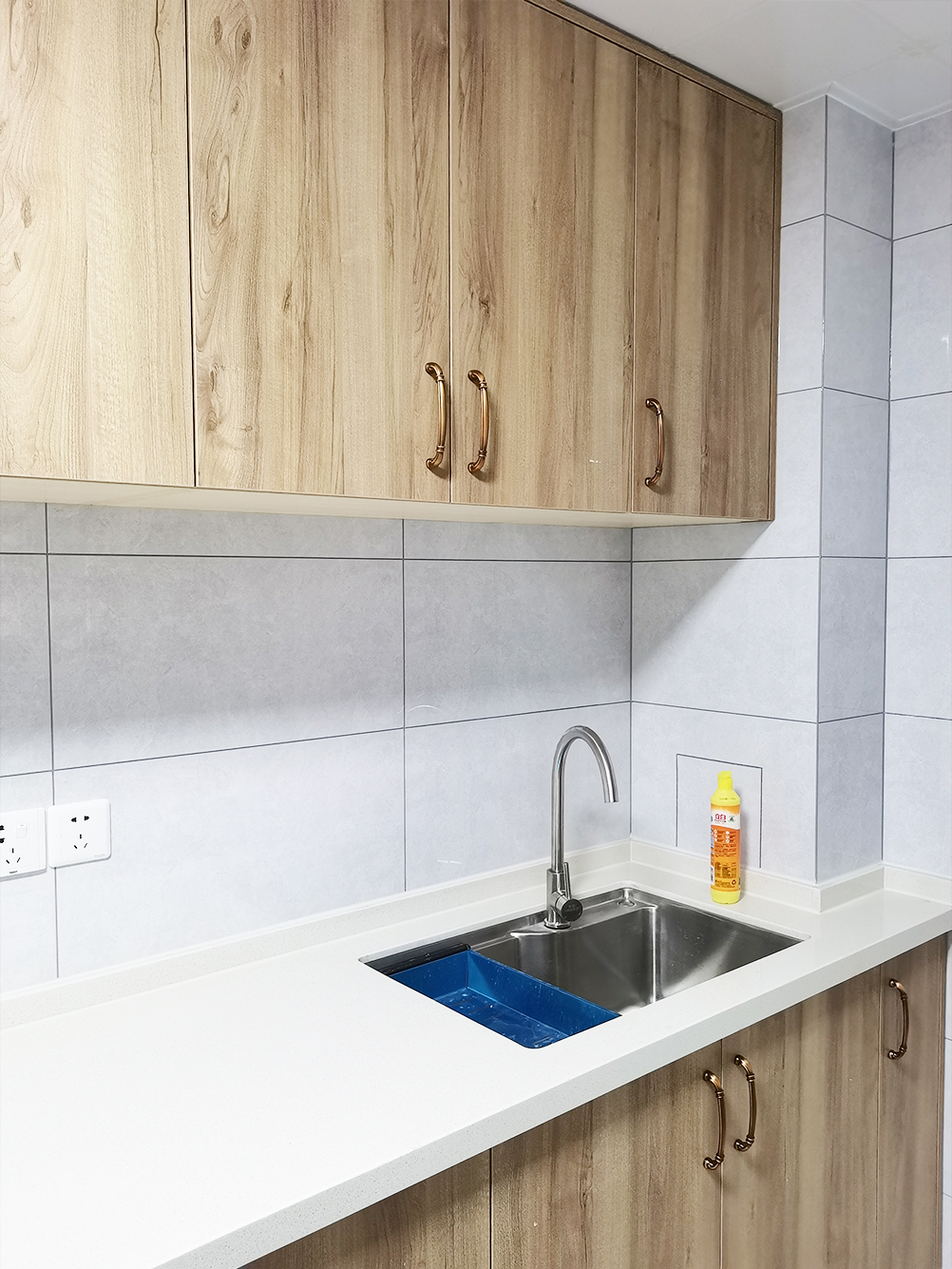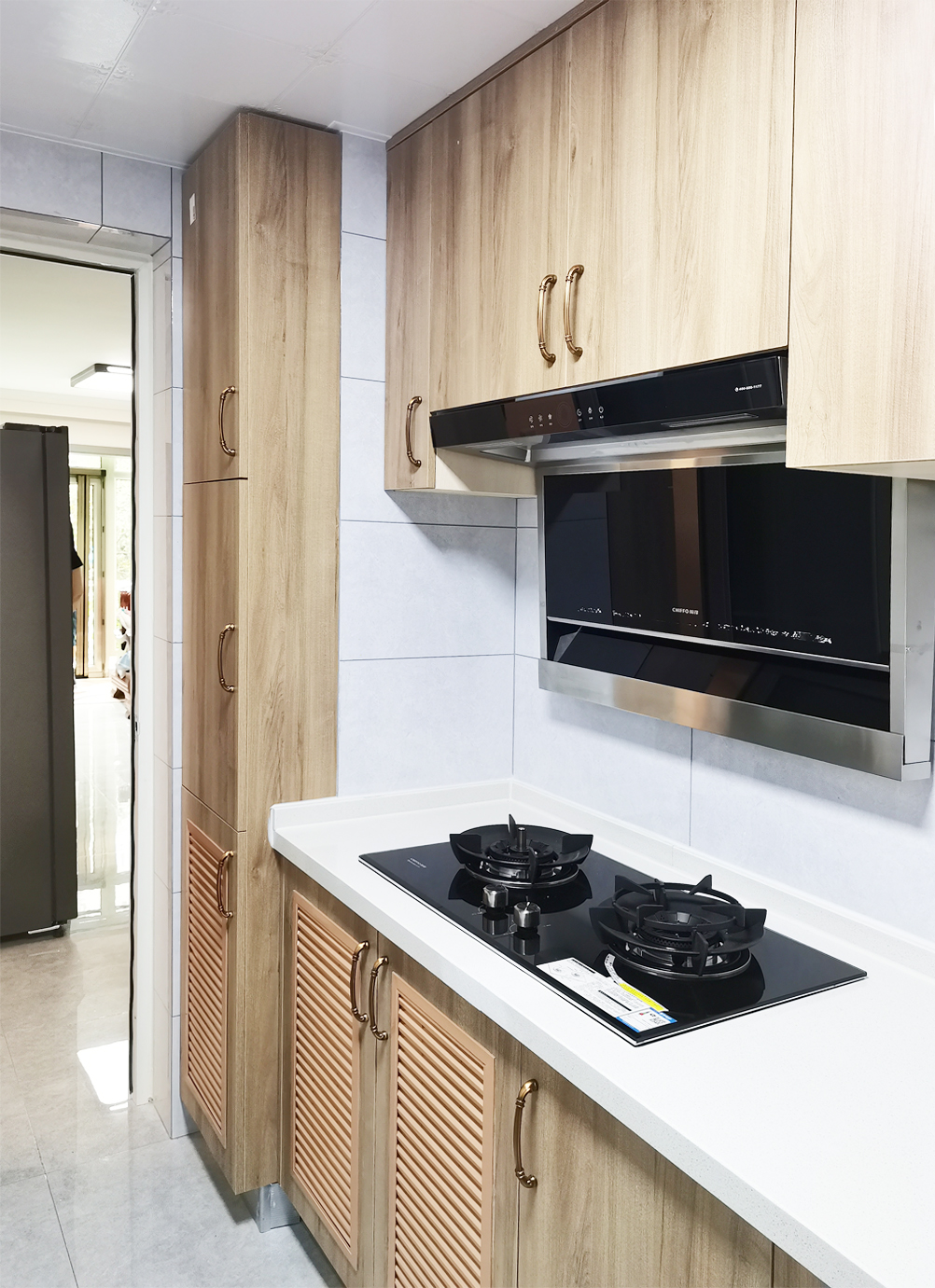 設(shè)計(jì)師拆掉原本L型的櫥柜,改為一字型櫥柜設(shè)計(jì),去陽臺(tái)更方便,在對面增加一組薄柜作為小電器的收納區(qū)。改造后的廚房洗切炒動(dòng)線合理、儲(chǔ)物充足。