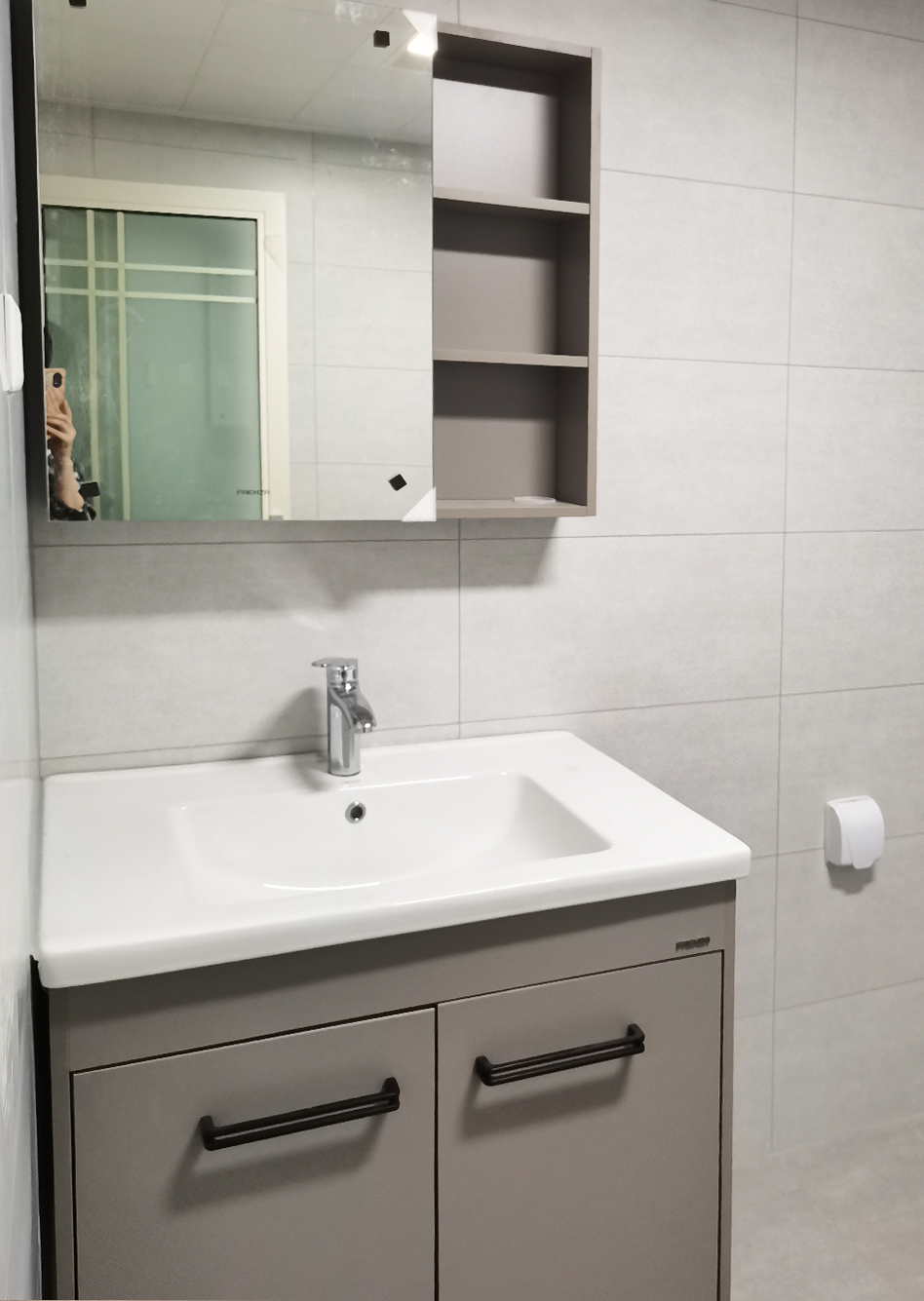 拆掉原有20公分高的地臺(tái),進(jìn)行馬桶移位,將蹲便改為坐便,后期淋浴區(qū)利用軟簾分隔,浴室柜增加儲(chǔ)物空間,改造后的衛(wèi)生間方便好用。