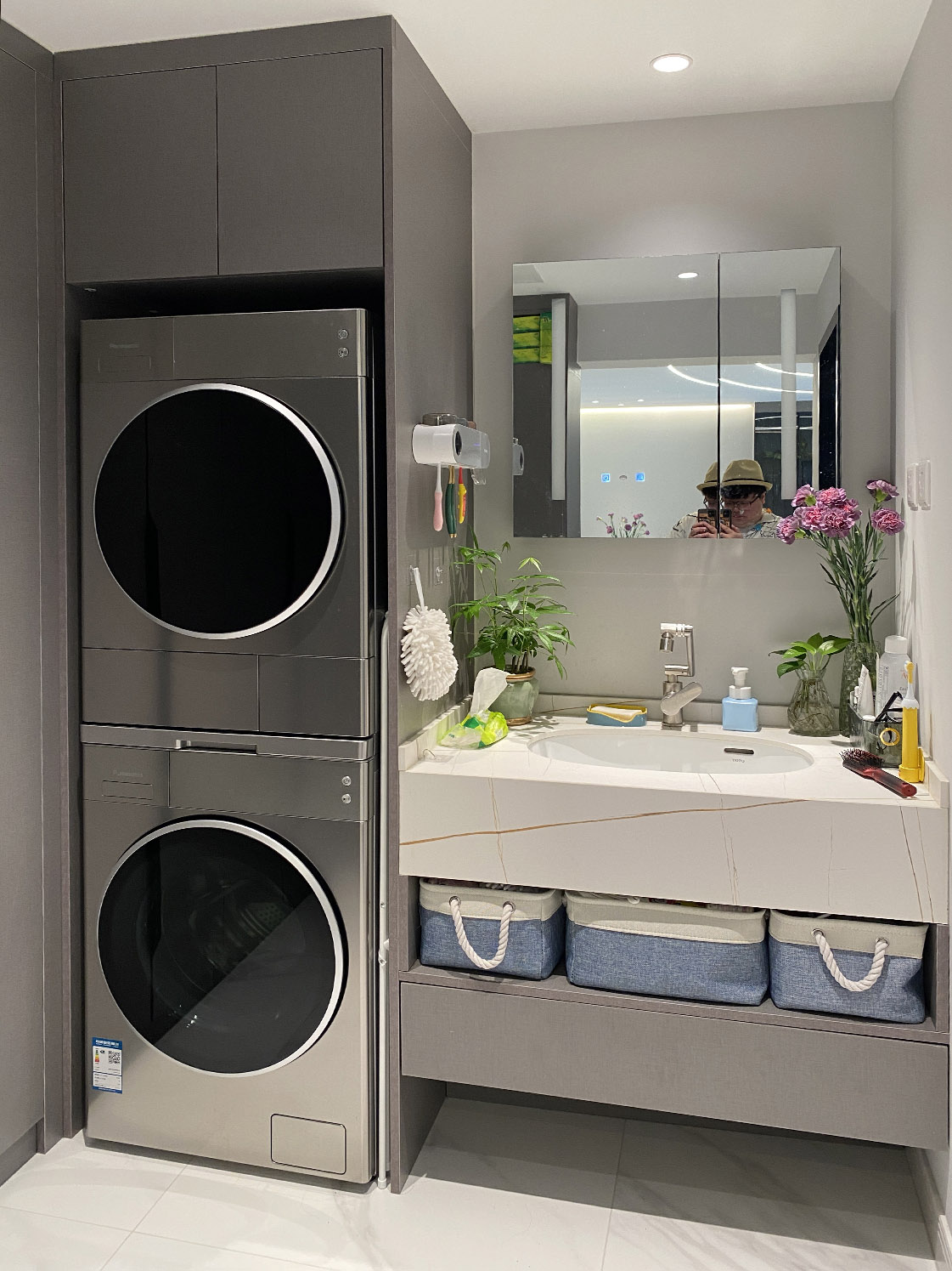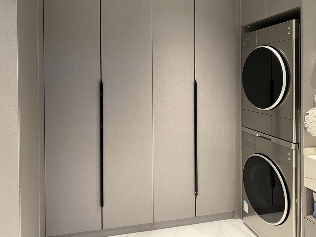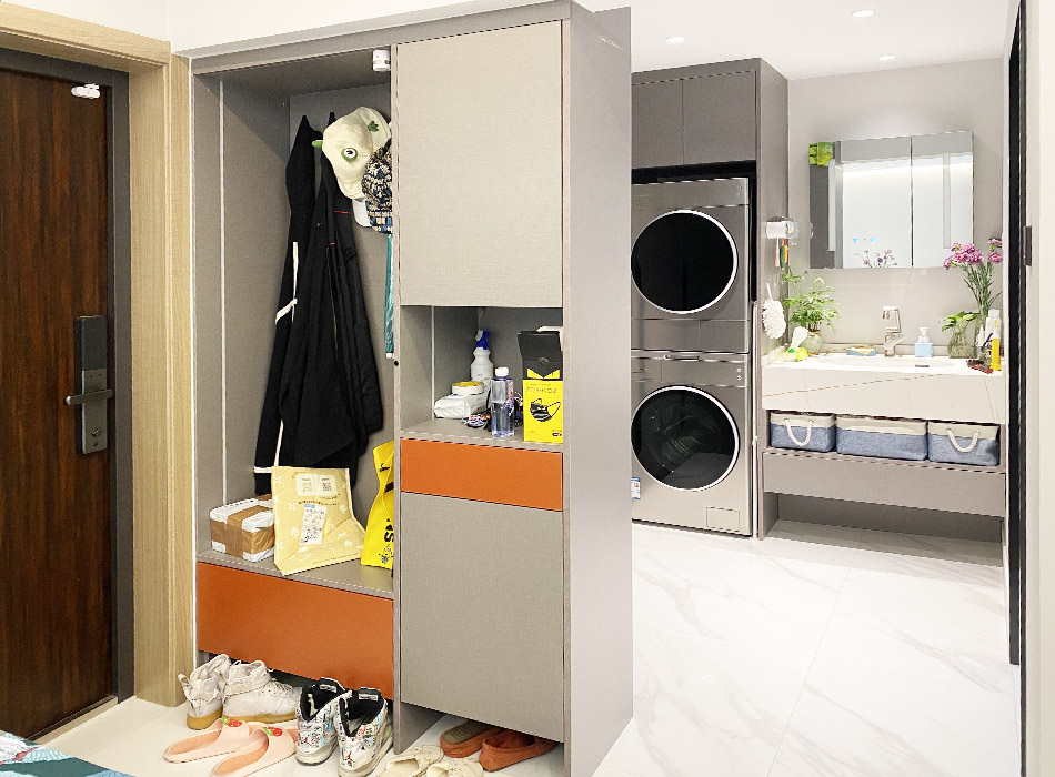 家政間融合了洗烘功能和收納功能,同時,也進(jìn)一步補(bǔ)充了門廳收納需求。