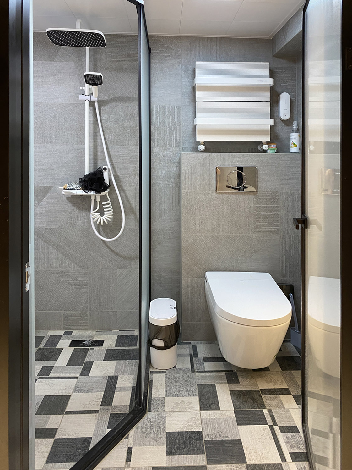 設(shè)計師改變了衛(wèi)生間門的位置,將洗手池外移,里面為業(yè)主規(guī)劃了如廁、淋浴和泡澡區(qū)。