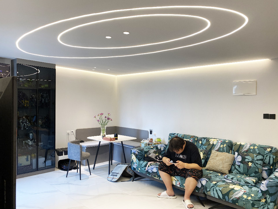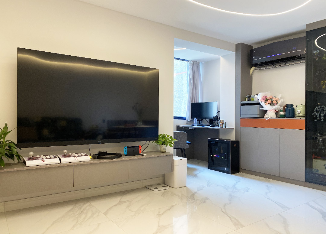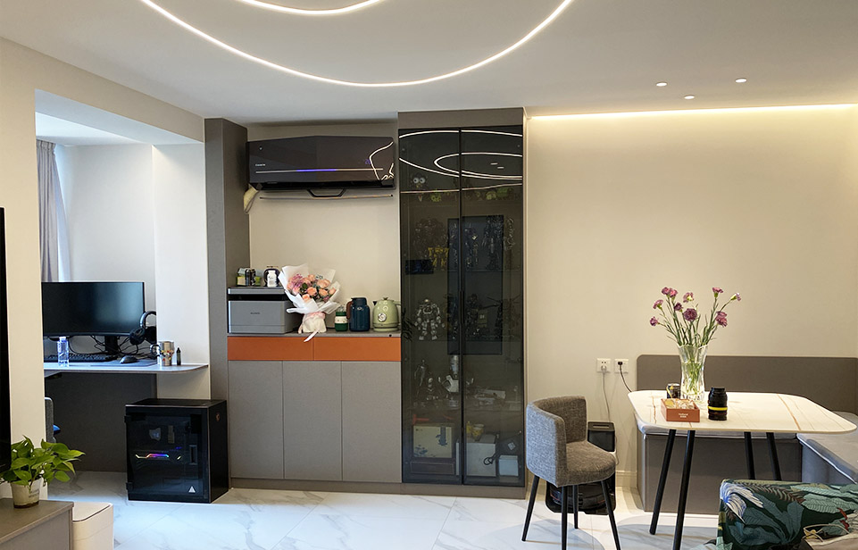 根據(jù)業(yè)主需求,客廳摒棄了傳統(tǒng)布局方式,利用潤元定制家具打造了集休閑、展示、儲物為一體的多功能空間。