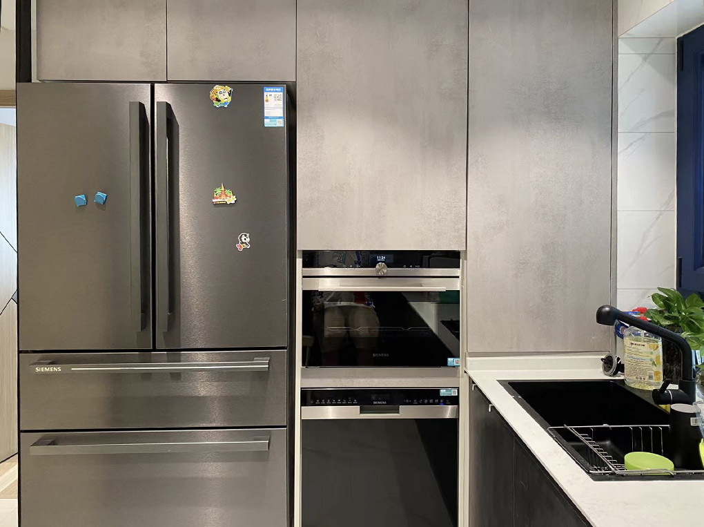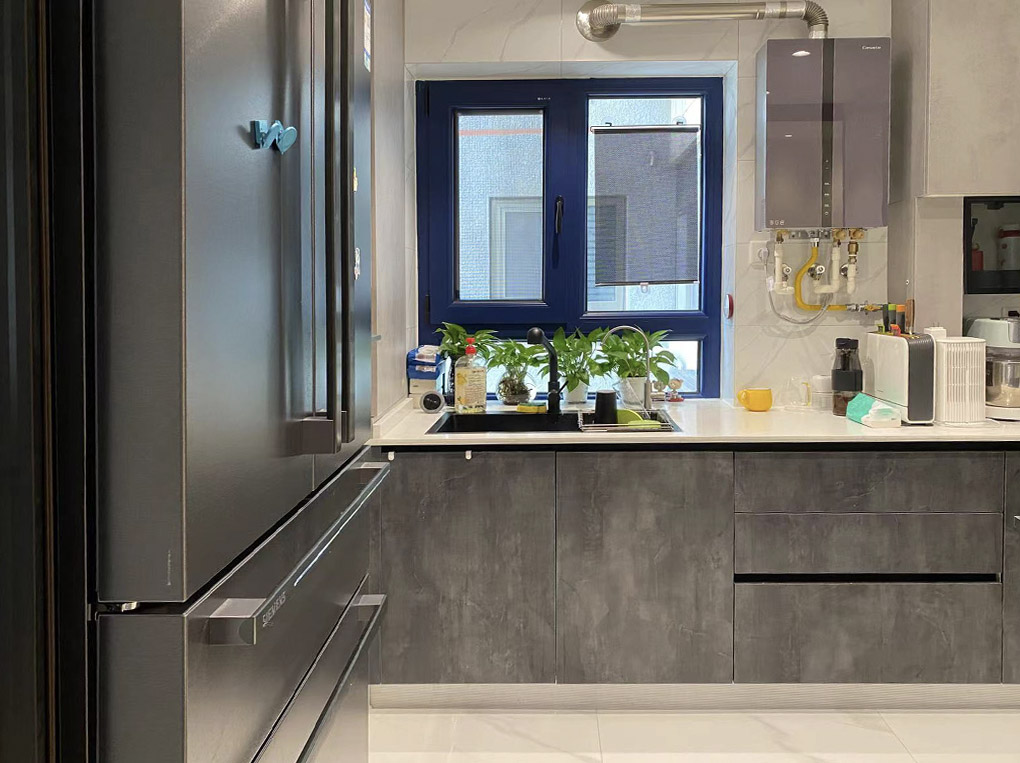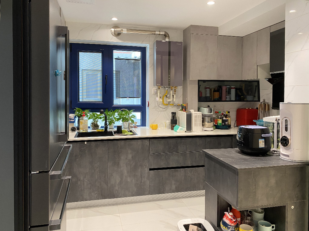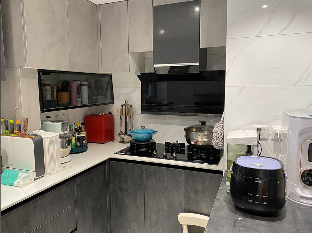 設(shè)計師利用潤元定制家具規(guī)劃了一組G形櫥柜以及高柜,使廚房儲物強(qiáng)大,功能齊全,動線合理。吧臺的設(shè)計,更便于一家人使用。玻璃推拉門讓整個廚房可開放,可封閉,美觀實用。