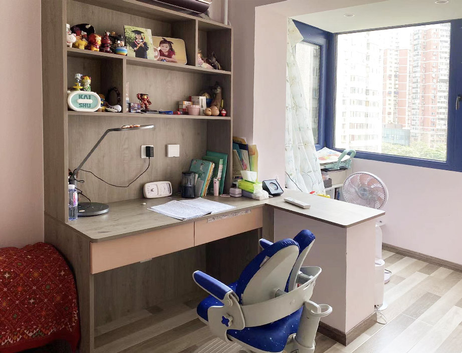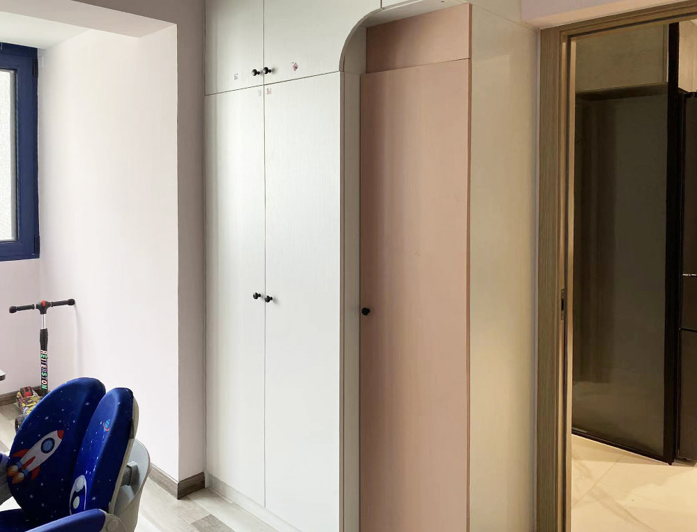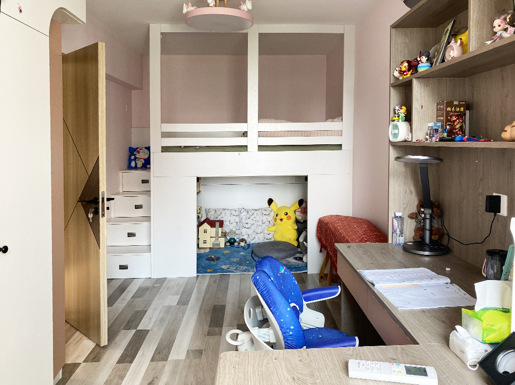 考慮到現(xiàn)在孩子還小,設(shè)計師在兒童房內(nèi)為小孩打造了一處秘密基地作為娛樂空間,等孩子長大后這里還可作為儲物區(qū),上面是睡眠空間。同時利用定制家具打造了學(xué)習(xí)區(qū)以及收納柜。