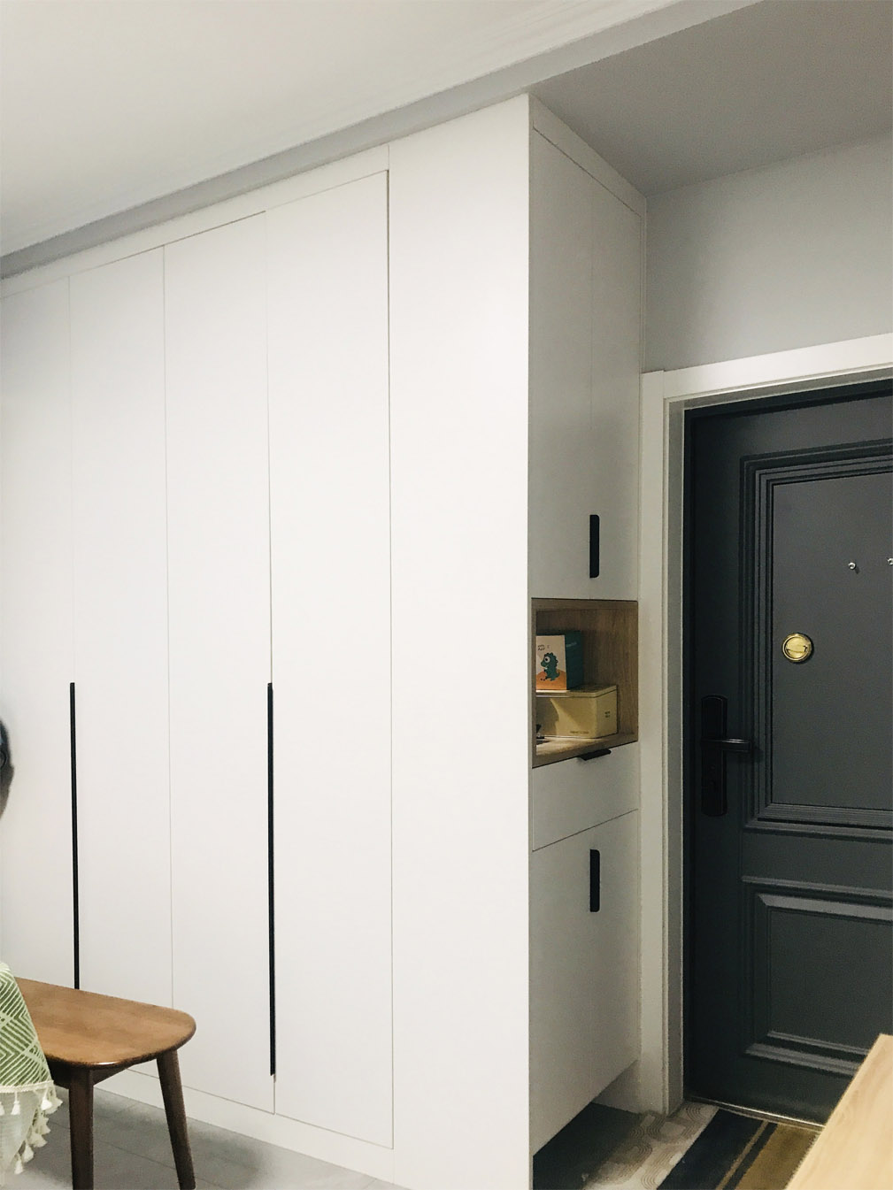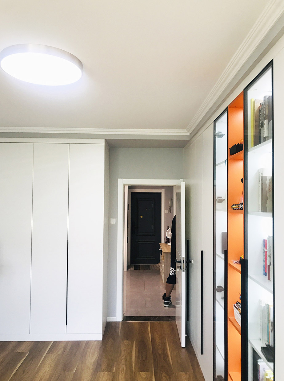 門廳——為了解決入戶缺少門廳的功能,設(shè)計師改變了入戶門的開啟方向,在進(jìn)門右手邊利用潤元定制家具打造了一組通頂鞋帽柜,以滿足門廳儲物需求。