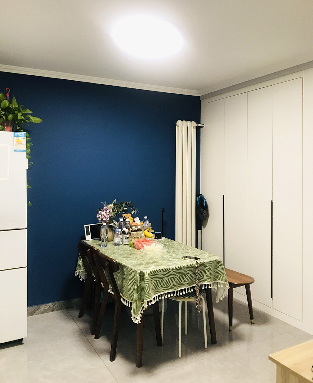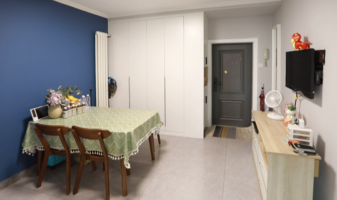 餐客廳——設(shè)計師封堵了原有衛(wèi)生間的門洞,將此面墻打造為電視墻,解決了客廳正對衛(wèi)生間的尷尬,將沙發(fā)改為四人位餐桌,將這里打造為一家人的觀影、用餐空間。