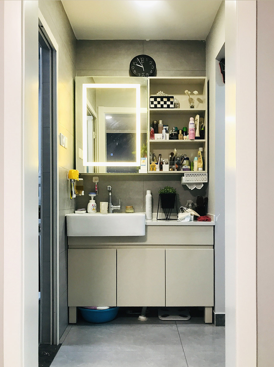 衛(wèi)生間——設(shè)計師更改了衛(wèi)生間門的位置,將洗手池外移,里面規(guī)劃了如廁、淋浴功能,實(shí)現(xiàn)了干濕分區(qū)。定制浴室柜合理利用空間的同時也增加了衛(wèi)生間儲物。