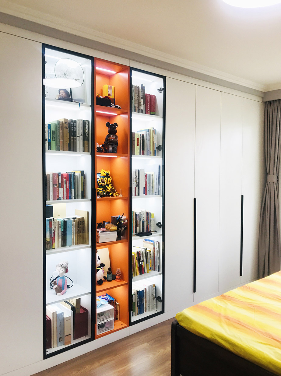 主臥——設(shè)計師重新規(guī)劃了主臥,調(diào)整了部分墻體后,將門后面一整面墻定制了通頂收納柜,以存放書籍和展示擺件。另一面墻則定制了通頂?shù)囊鹿瘛?/span>