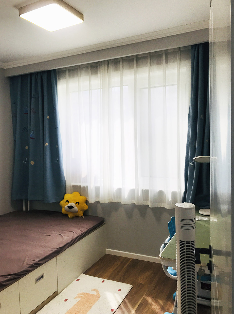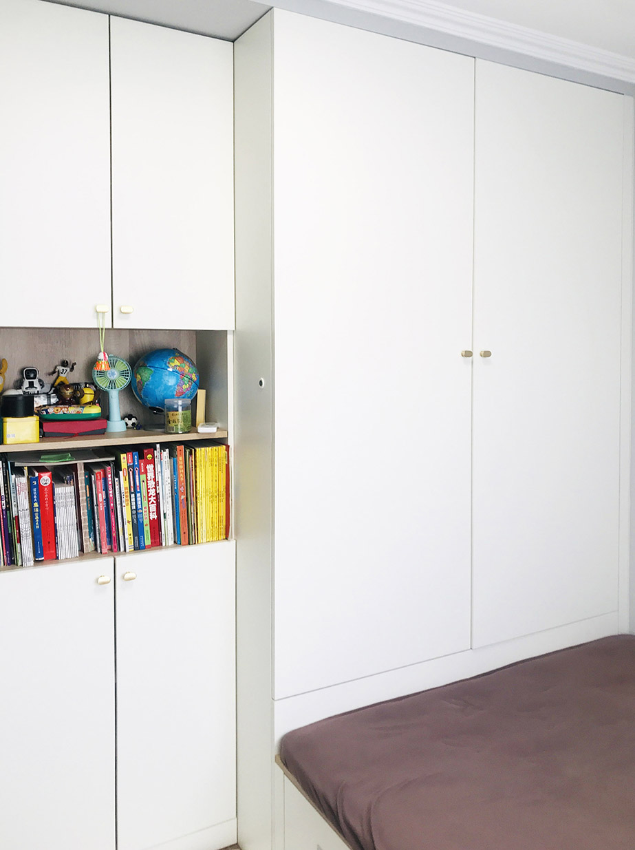 兒童房——次臥空間較小,又要滿足休息,儲物,學(xué)習(xí)等需求,設(shè)計師在這里利用定制家具打造了榻榻米,衣柜和書柜以滿足孩子生活需求。