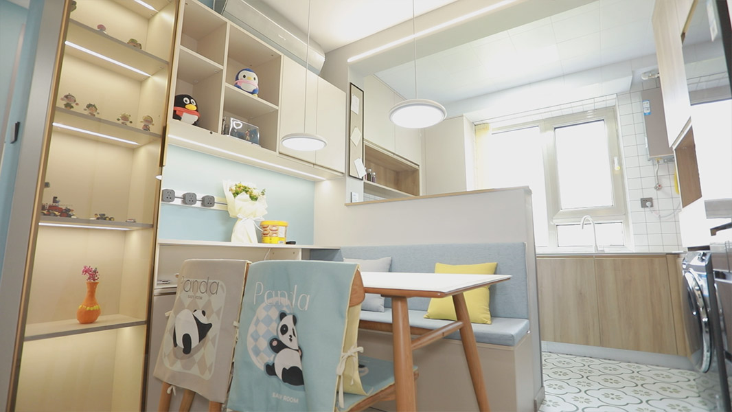 設(shè)計(jì)師將原廚房和儲(chǔ)物間之間的輕體墻拆除,將兩個(gè)空間合二為一,通風(fēng)和采光更加充足,面積更大,重新規(guī)劃這個(gè)空間,打造為餐廚一體的多功能空間。