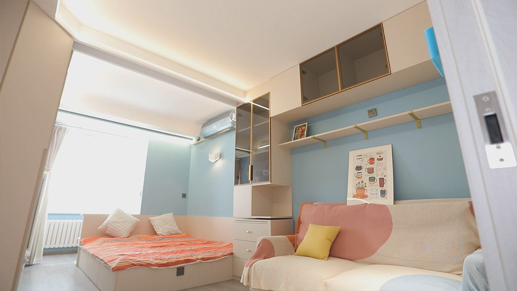 設(shè)計(jì)師將原本的客餐廳空間一分為二,里面空間更為私密,作為夫妻倆的臥室,外面則規(guī)劃為多功能空間,這里既可以作為與孩子的活動(dòng)區(qū),也可以補(bǔ)充客廳功能。陽臺(tái)也充分利用了起來,規(guī)劃為了辦公區(qū)域。