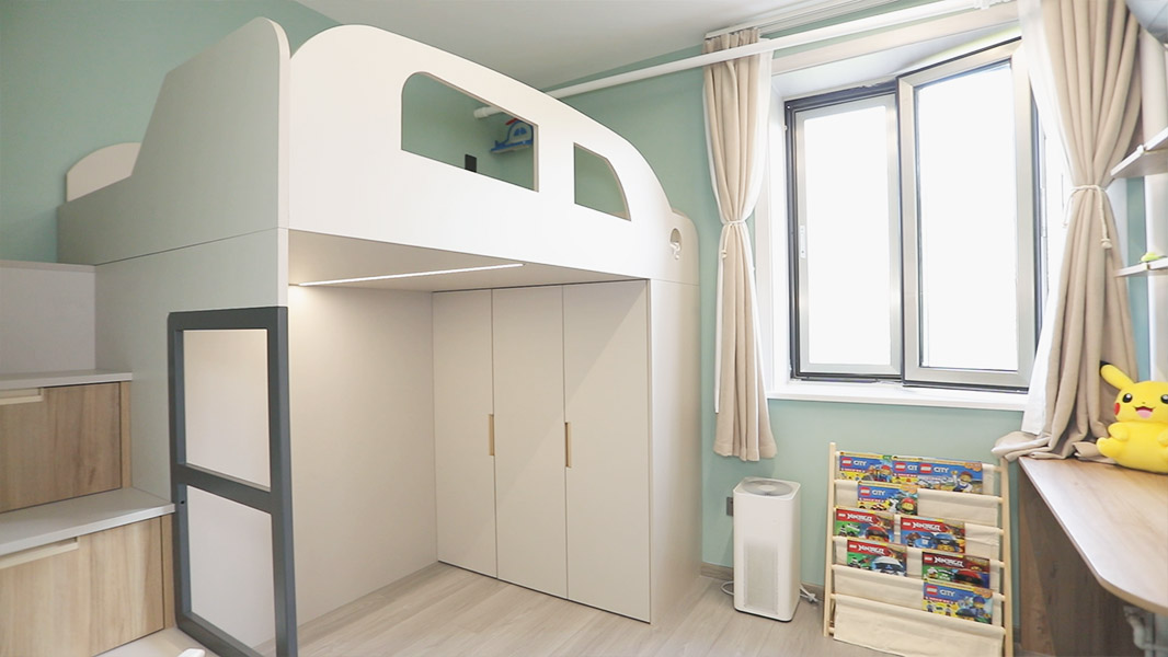 兒童房面積不大,休息區(qū)規(guī)劃為了上下層的結(jié)構(gòu),上面作為睡眠空間,下面可以作為娛樂玩耍空間。整面定制柜結(jié)合書桌的設(shè)計(jì)滿足了孩子學(xué)習(xí)及房間儲(chǔ)物的功能需求。