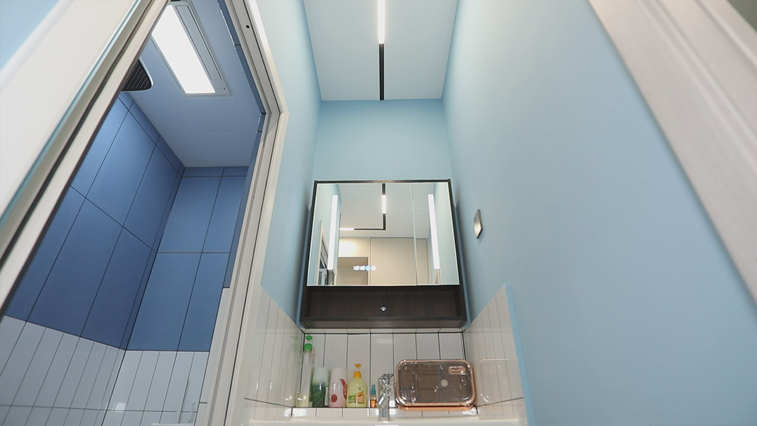 設(shè)計(jì)師將原衛(wèi)生間結(jié)合次臥一起進(jìn)行了改造,將它們共用的墻體向次臥方向移動(dòng)了60多厘米,洗臉池規(guī)劃在了這里,打造為衛(wèi)生間的干區(qū)。同時(shí)封堵原衛(wèi)生間門洞,開在了側(cè)面,解決了衛(wèi)生間門洞正對(duì)入戶門的尷尬,里面則打造為了衛(wèi)生間濕區(qū),提供馬桶、淋浴功能。