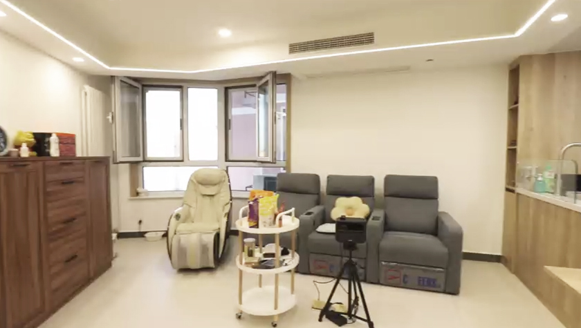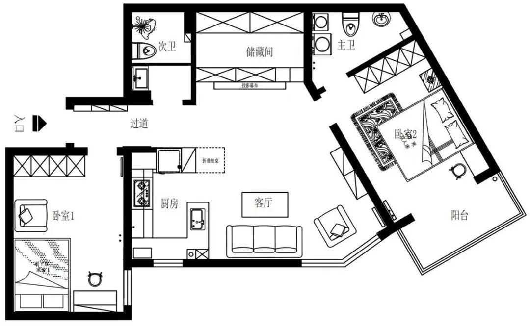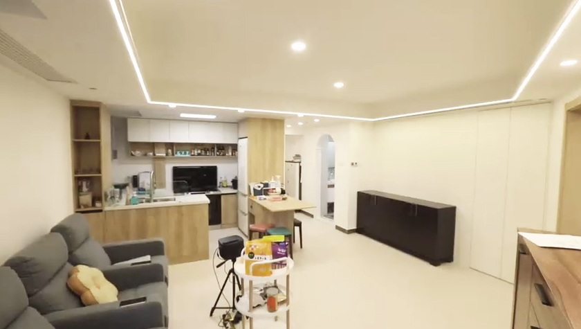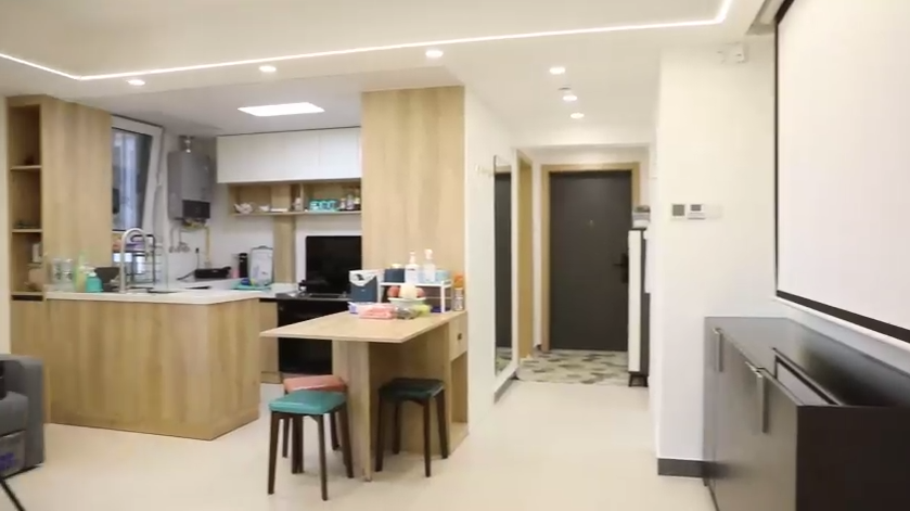 設(shè)計(jì)師將原來餐區(qū)的位置規(guī)劃了一個儲藏間,為了與客廳更好的融合,儲藏間的門,用柜體做成了隱形門,投影隱藏在這面墻上面,家里實(shí)現(xiàn)了投影的設(shè)計(jì)。
