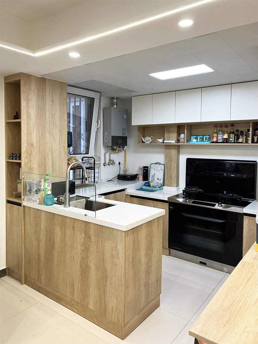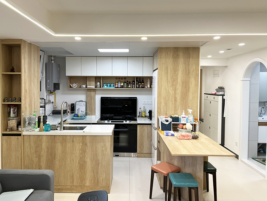 設(shè)計(jì)師拆除了原廚房和客廳共用的一面輕體墻,改為了開放式廚房,并且將整個空間規(guī)劃為了餐廚一體空間,廚房面積擴(kuò)大后,將原來的L型櫥柜改為了U型櫥柜,增加了儲物收納,一組高低柜,放置冰箱和折疊餐桌,用餐更方便。