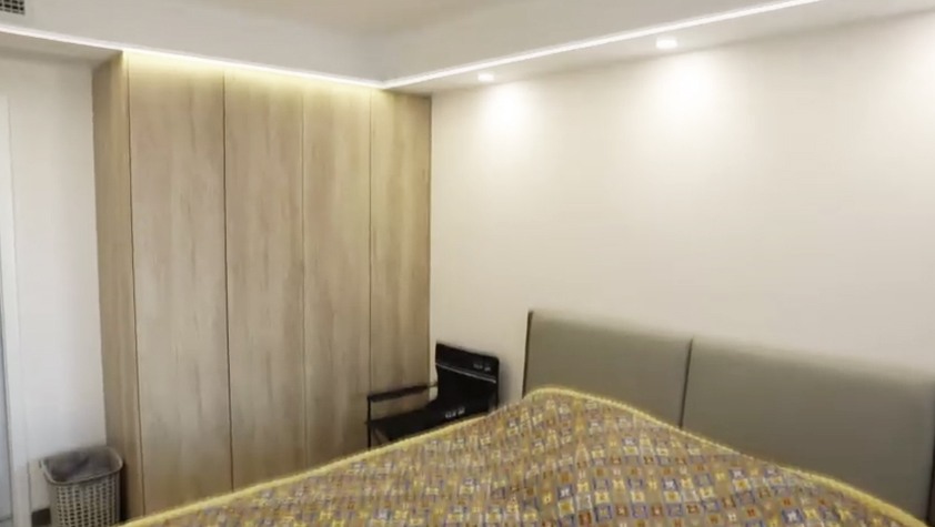 主臥室規(guī)劃了四門定制衣柜,儲物量充足,陽臺的啞口還做成了弧形,增強(qiáng)了主臥室的美感。
