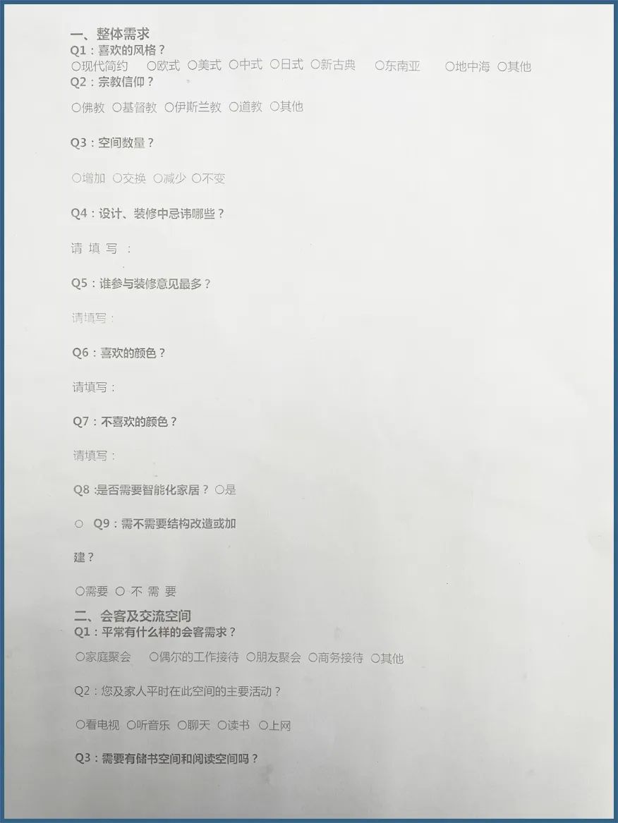 在這個階客戶到店后,首先我們會有一個81項的客戶情況調(diào)查表先讓業(yè)主填寫一下,通過調(diào)查表了解一下客戶基本情況,比如家庭結(jié)構(gòu),生活習(xí)慣,風(fēng)格喜好等等。段一般咨詢的客戶分為兩種情況,一種是打客服熱線來咨詢的客戶,另一種是到店和設(shè)計師面對面咨詢的客戶。