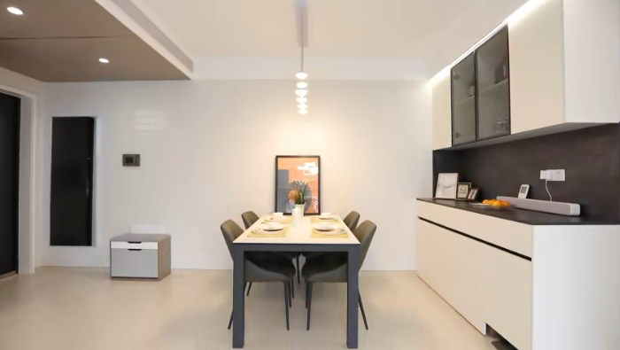設(shè)計(jì)師將墻體拆改后,整個(gè)餐區(qū)還是非常寬敞明亮的,能夠滿足多人就餐的需求,配合餐邊柜,解決餐廳周邊的收納,臺(tái)面可以放置小家電,下方還專門設(shè)計(jì)了放置掃地機(jī)器人的位置。