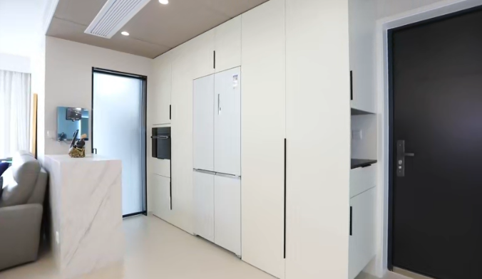 設(shè)計(jì)師將廚房和客廳共用的這面墻,往廚房方向移了40厘米,廚房外面,規(guī)劃了西廚區(qū),西廚區(qū)與門廳柜相連,整體定制柜體,把蒸烤一體機(jī)、冰箱嵌入其中。