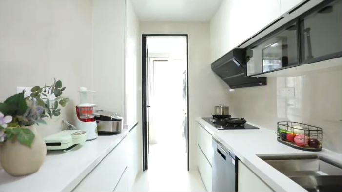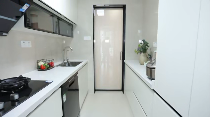 中廚縮小到5平米,雙一字形櫥柜,無(wú)論是操作還是儲(chǔ)物空間都得到了極大的提升。中西廚用隱藏式推拉門進(jìn)行分隔,阻隔油煙的同時(shí)還更節(jié)省空間。