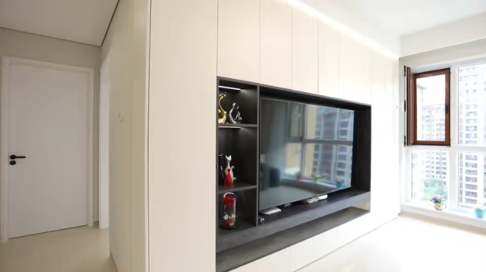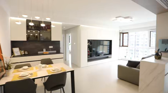 門廳、西廚、餐廳、客廳,整體都是這種偏極簡(jiǎn)的風(fēng)格,這也符合蔡先生想要的年輕的感覺??蛷d里還增加了收納柜,整個(gè)空間整潔,明亮。