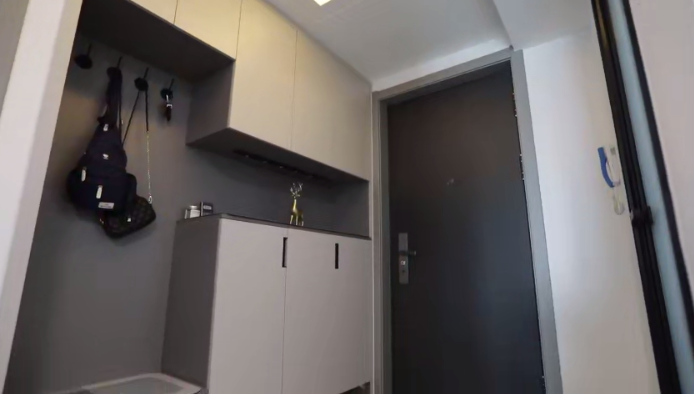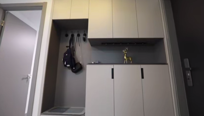 設(shè)計(jì)師將入戶門的開啟方向,從右開變?yōu)樽箝_,同時(shí)拆掉次臥的非承重墻體,把墻體往里推了35厘米,這樣就摳出一個(gè)鞋柜空間。在頂面上方做了下沉式方形吊頂,弱化橫梁的突兀感,讓門廳功能更完整。