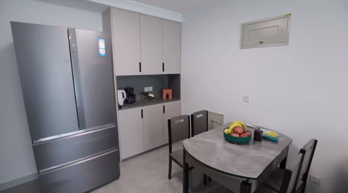 餐廳區(qū)定制了1.3米的餐邊柜,展開可供8人用餐的折疊桌。冰箱沒有采用嵌入式設(shè)計(jì),也體現(xiàn)了設(shè)計(jì)的以人為本,充分尊重業(yè)主的生活習(xí)慣。