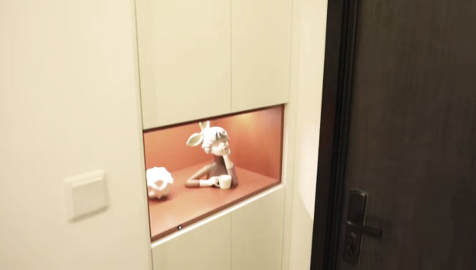 設(shè)計師封堵了廚房門,并向里推了40厘米,借了廚房的空間給門廳做了鞋柜,頂面利用筒燈來提亮整個空間,門廳儲物充足,采光充分。