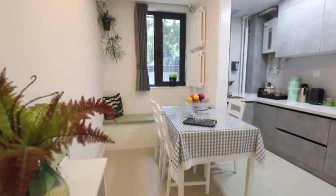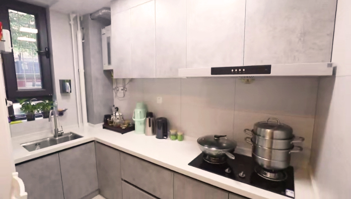 把廚房與小客廳之間的這面墻拆掉,廚房變成開放式,形成餐客廚一體化的設(shè)計,融合后整個空間面積達到10.7平米。廚房一組L形櫥柜,洗、切、炒動線合理,儲物充足。