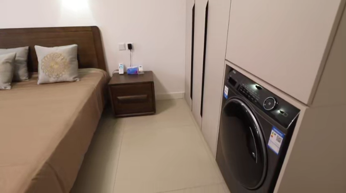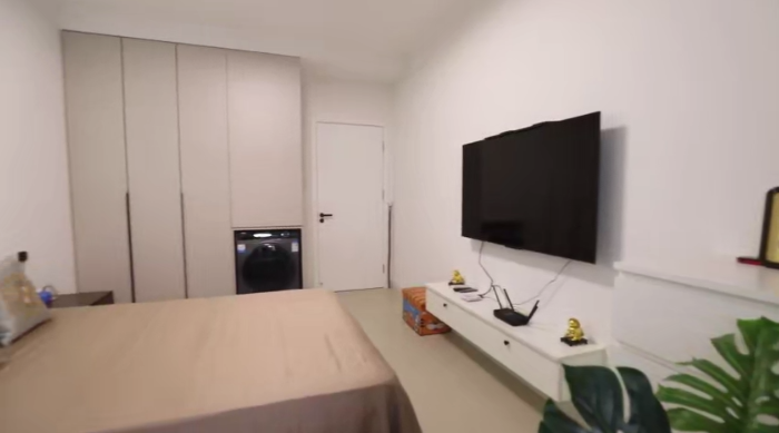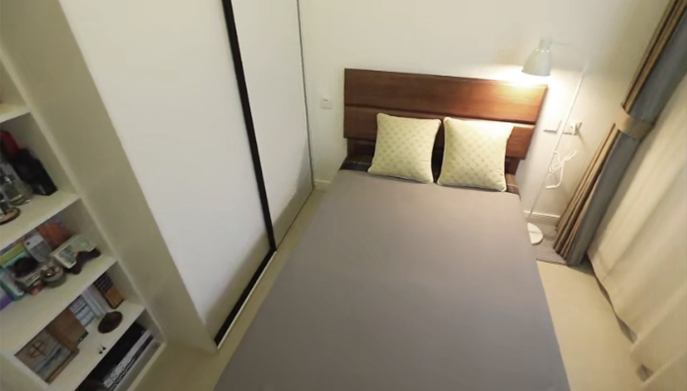 次臥面寬2.7米,做了60厘米寬的衣柜、再放下1.2米單人床,兩邊分別剩下50厘米左右的走道空間,完全不影響通行。房間角落放了桌椅,作為休閑區(qū)。