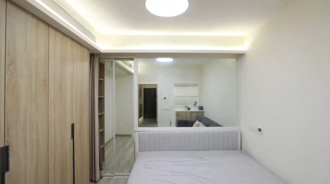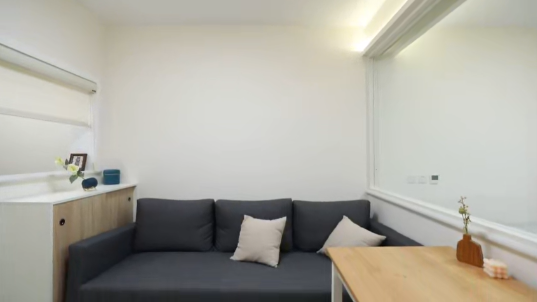 設(shè)計(jì)師將這部分面積15平米的空間,利用一道隔斷一分為二,一部分作為主臥,一部分作為多功能廳,廳里放置了沙發(fā)床,平時(shí)作為會(huì)客區(qū),拉開(kāi)后又可以作為休息區(qū),可折疊餐桌,平時(shí)可作為茶幾,拉開(kāi)后就是一個(gè)六人位的餐廳。