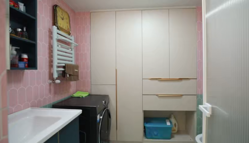 設(shè)計(jì)師將衛(wèi)生間進(jìn)行了干濕分區(qū),考慮到業(yè)主身材較高,將淋浴間擴(kuò)大1米2,浴室柜的高度也做到90厘米,這樣業(yè)主使用更舒適。利用煙管和下水管中間1米7長(zhǎng)度,做了定制的家政柜,滿足儲(chǔ)物收納。