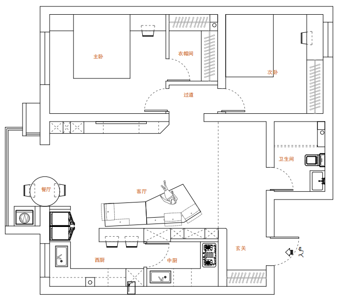 小兩口的這套婚房建筑面積100平米,實(shí)際使用面積74平米,兩室一廳一廚兩衛(wèi)。照理說(shuō)兩個(gè)人住這套房子,暫時(shí)是夠用的,但考慮到未來(lái)家庭人口結(jié)構(gòu)的變化,生活方式也會(huì)隨之變化,所以小兩口希望眼下的設(shè)計(jì)除了能夠符合當(dāng)下的生活需求,還能夠滿足未來(lái)的使用。
