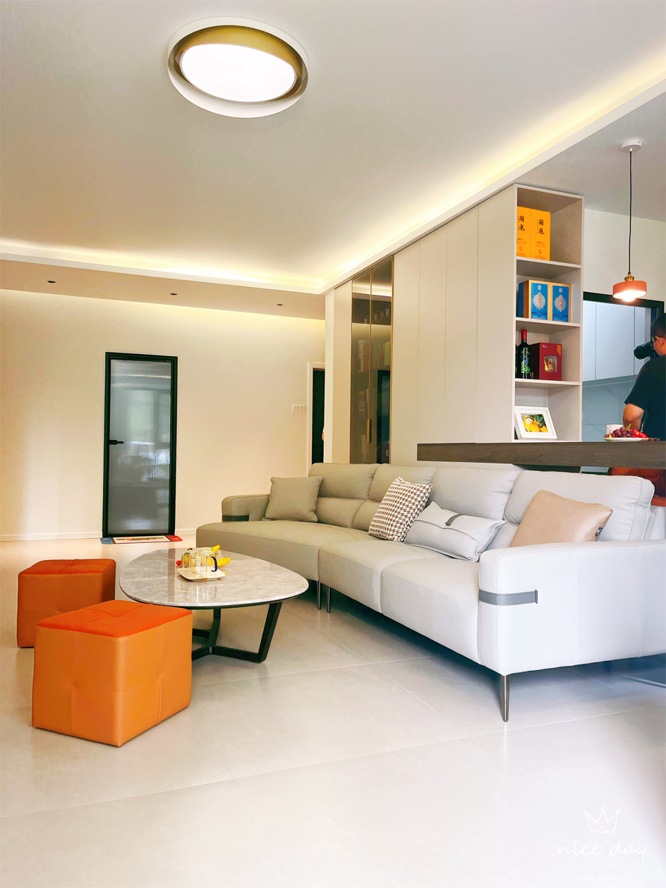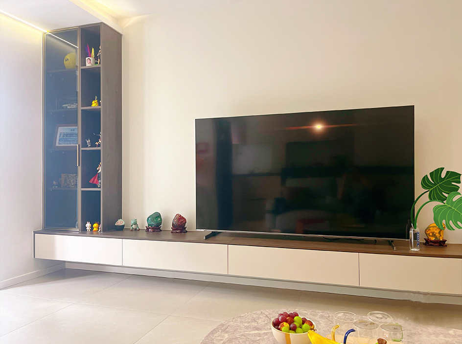 沙發(fā)和電視墻的位置對(duì)調(diào),會(huì)客區(qū)與廚房相鄰,從動(dòng)線上更合理。沙發(fā)背后、電視墻都結(jié)合空間做定制柜,滿足書籍、物品的收納和展示。