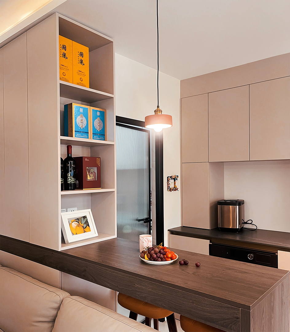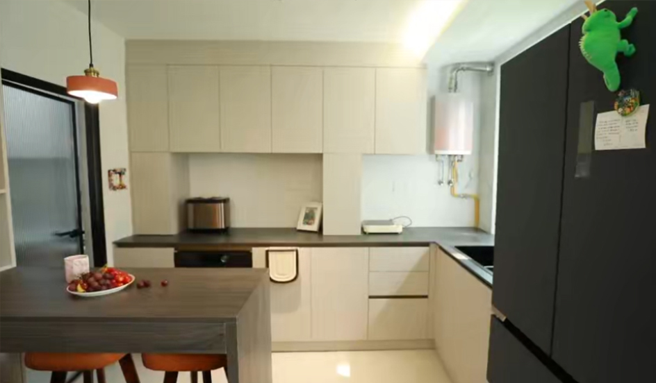 拆除廚房和客廳間不承重的輕體墻,重新規(guī)劃廚房,打造了中西廚結(jié)合的形式,中廚用鎂鋁門做分隔,阻隔油煙。西廚部分與客廳聯(lián)通,將現(xiàn)代化的廚電設(shè)備融入其中。