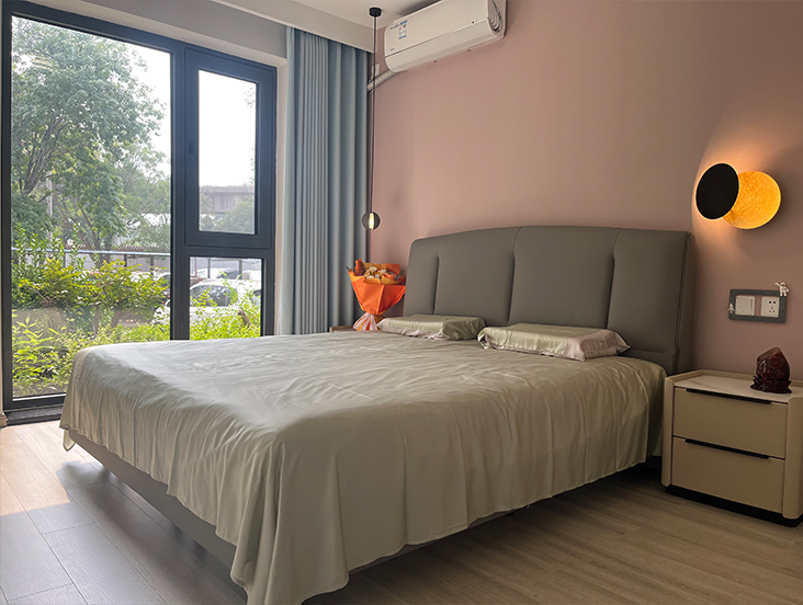 主臥13平米,滿足了婚房所需的氛圍感,除了在墻面、燈飾上營(yíng)造溫馨外,并沒(méi)有做定制衣柜,空間留白,也是為小兩口未來(lái)有孩子,放嬰兒床預(yù)留足夠空間。