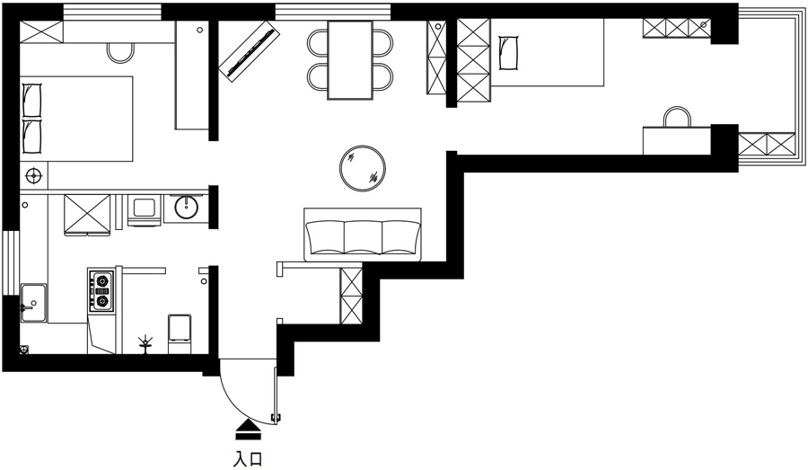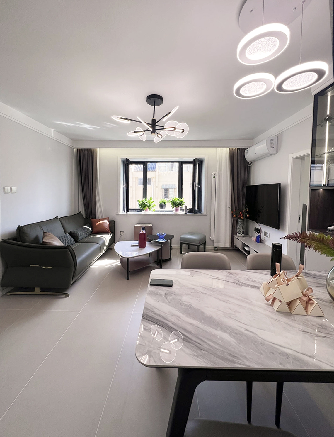 客廳進(jìn)行了重新布局,餐區(qū)規(guī)劃在了這里,原來壁櫥的這個(gè)空間除了規(guī)劃了門廳鞋帽柜之外,剩余的這部分空間規(guī)劃了冰箱和餐邊收納。而且餐區(qū)規(guī)劃在這里,距離廚房也更近,行走路徑最短,也更加合理。而剩余的空間則規(guī)劃了一個(gè)完整的客廳,布局優(yōu)化后,生活起來更加舒適。