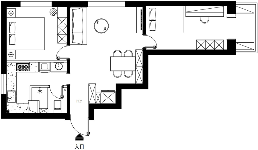 設(shè)計(jì)師拆除了進(jìn)門右手邊的壁柜,將這個(gè)空間重新規(guī)劃。定制了一組40厘米寬、一米長的通頂衣帽柜,滿足日常進(jìn)出換鞋、掛衣的需求。