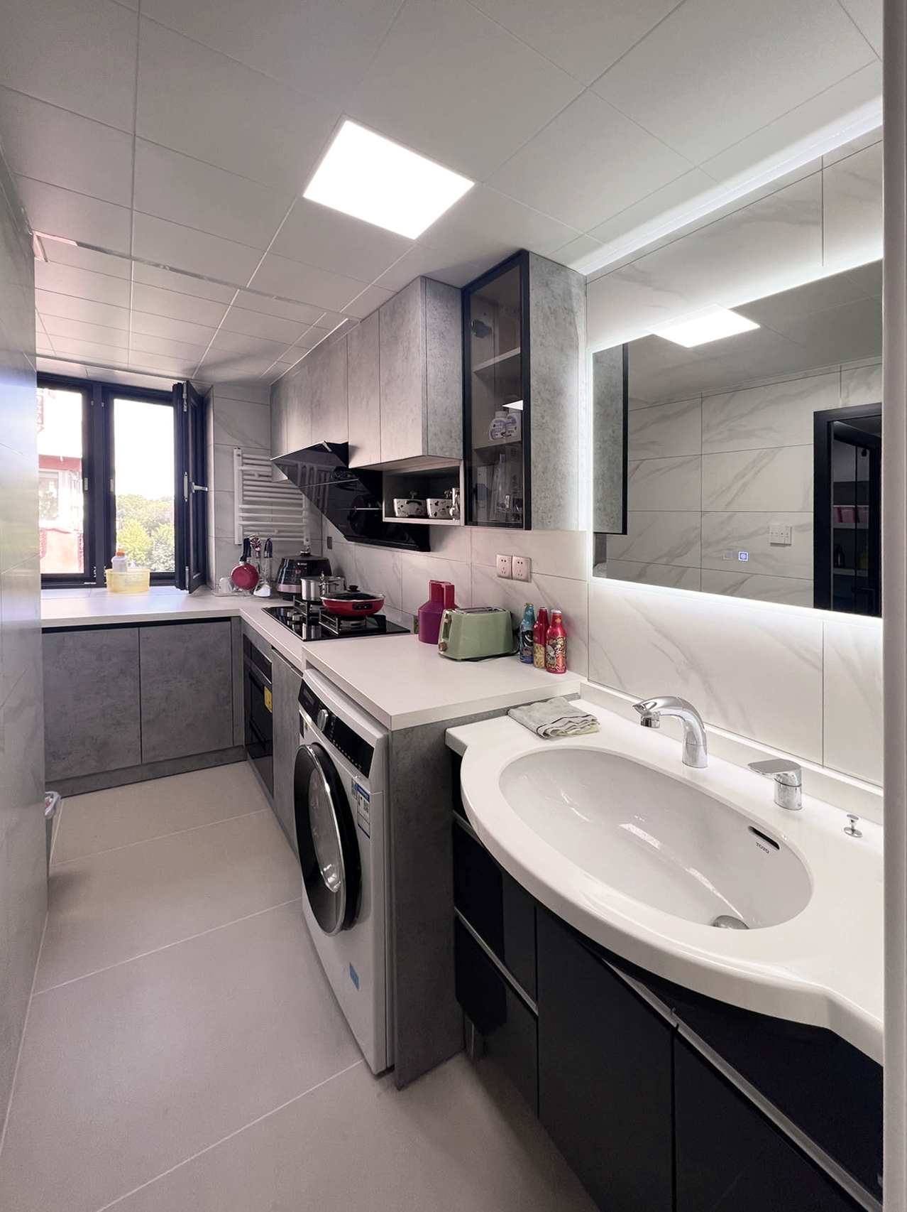 設(shè)計(jì)師先將廚房和衛(wèi)生間相鄰的這面墻往廚房方向移了30厘米,衛(wèi)生間由原來的2.1平米擴(kuò)大到現(xiàn)在的2.5平米,做了淋浴房,實(shí)現(xiàn)了馬桶和淋浴的分離,洗手盆和洗衣機(jī)依舊在這個(gè)位置,并且利用定制家具做了儲(chǔ)物空間的規(guī)劃。