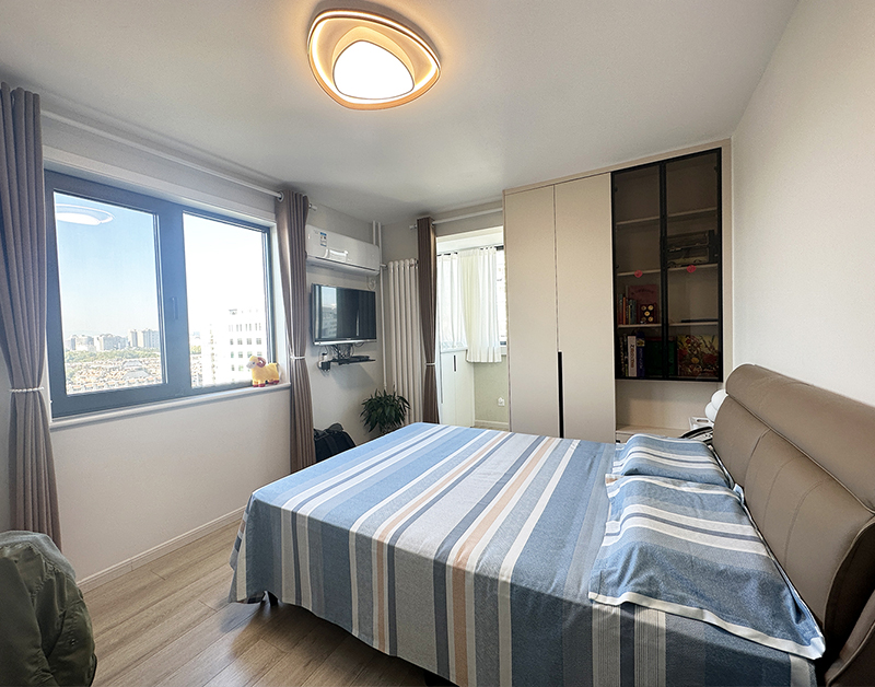 兩間臥室充分利用空間做了沿墻收納,特別是次臥室,門洞往左移了40厘米,這樣一來,門后的空間也利用上了。